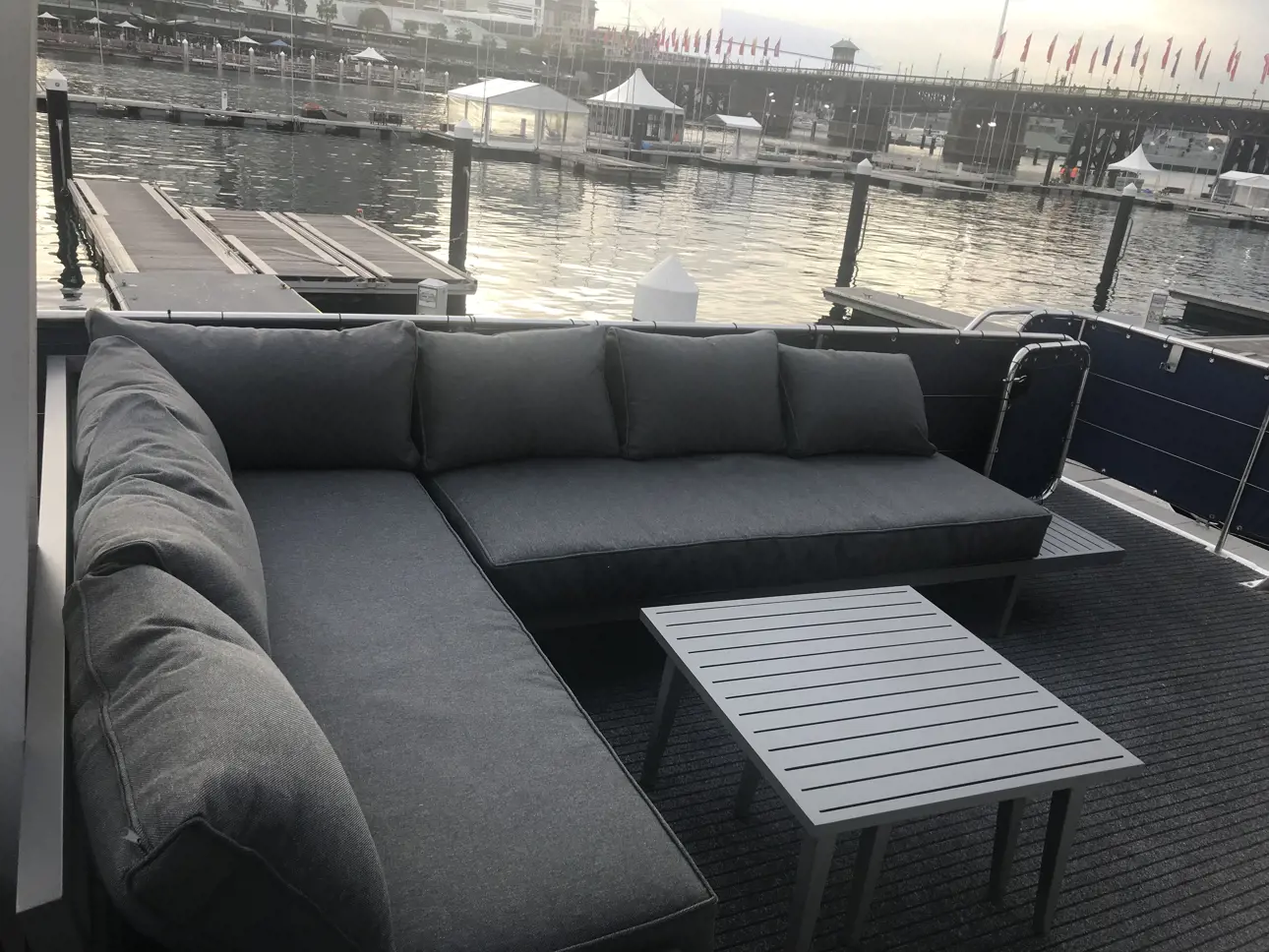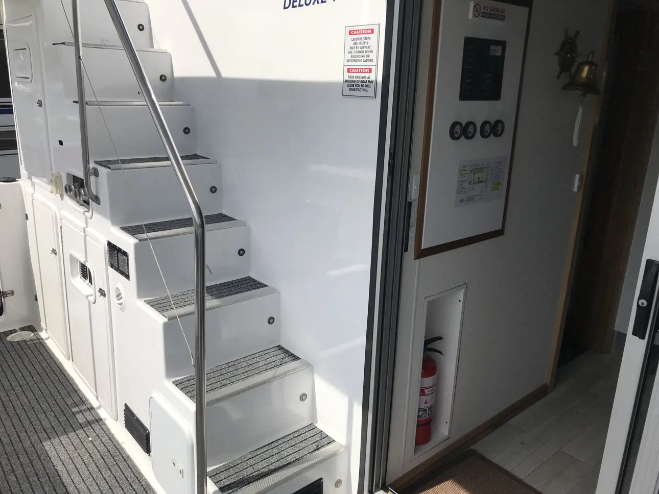 - Large boarding platform with rear swim ladder